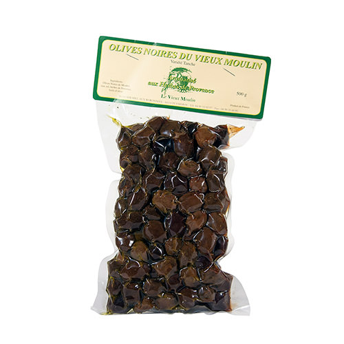 Spécificité : Olives noire cueillie en légère sur-maturité, ridée par les premières gelées, cette olive moelleuse et savoureuse est préparée selon la tradition du Vieux Moulin uniquement avec de l’eau et du Sel.